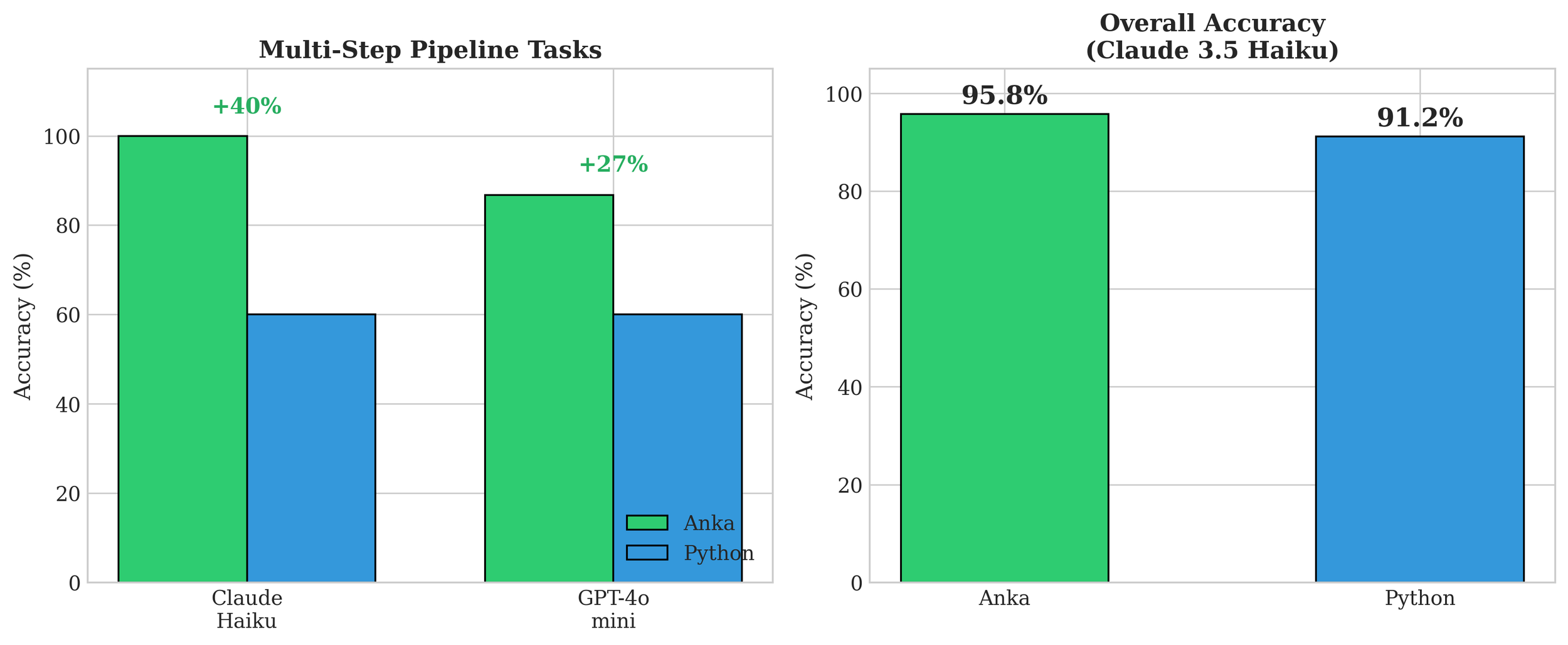 Published on arXiv (arXiv:2512.23214) in December 2025, Anka is a solo undergraduate research project in which I designed a novel domain-specific language (DSL) for data transformation pipelines, purpose-built to improve the reliability of code generated by Large Language Models. The core insight behind Anka is that the flexibility of general-purpose languages like Python, while powerful for human programmers, introduces ambiguity that causes LLMs to make systematic errors on complex, multi-step tasks. Anka addresses this by enforcing explicit, constrained syntax where each operation has exactly one canonical form, reducing the room for error during code generation. Despite having zero prior training exposure to the language, Claude 3.5 Haiku achieved 99.9% parse success and 95.8% overall task accuracy across a benchmark suite of 100 data transformation tasks. Most notably, Anka demonstrated a 40 percentage point accuracy advantage over Python on multi-step pipeline tasks (100% vs. 60%), a result validated across both Claude 3.5 Haiku and GPT-4o-mini. This project demonstrates that domain-specific languages purposefully designed for LLM generation can outperform general-purpose languages on which the model has extensive training. I released the complete language implementation, benchmark suite, and evaluation framework as open-source tools to support further research in this emerging area of AI-assisted programming.