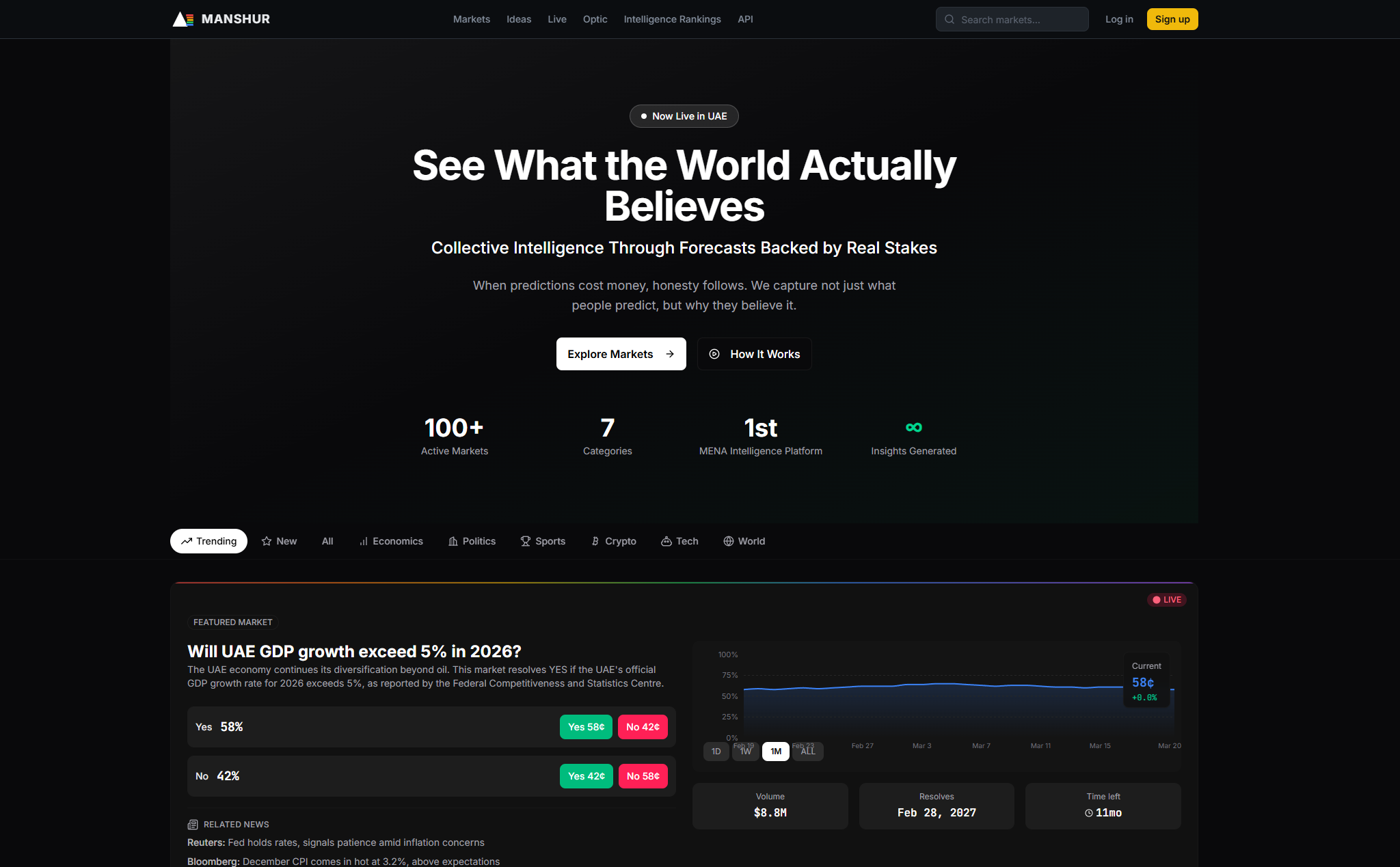 MANSHUR (manshur.ai) is a prediction market platform I am building as the founder through my venture, 6265labs. Unlike conventional prediction market platforms that only display probabilities, MANSHUR captures the reasoning behind every trade, creating a dataset of human forecasting intelligence. The platform features over 100 active markets spanning economics, politics, sports, crypto, tech, and world events, with a unique "Intelligence Capture" system that requires traders to share why they are making a prediction through quick tags and detailed theses. MANSHUR introduces Forecaster IQ, a reputation system that ranks users based on reasoning quality rather than just returns, rewarding how people think rather than simply their accuracy. The platform is designed from the ground up for UAE GCGRA regulatory compliance, positioning it as the first prediction intelligence platform in the MENA region. Built with a full-stack architecture including a real-time market engine, intelligence rankings leaderboard, an ideas feed, and a public API, MANSHUR represents my work at the intersection of AI, quantitative finance, and platform design. The project draws directly on my experience at ADIA and my research in multi-agent AI trading systems, bringing together my technical skills in Python, API development, and data engineering with my understanding of financial markets and regulatory frameworks in the Gulf region.